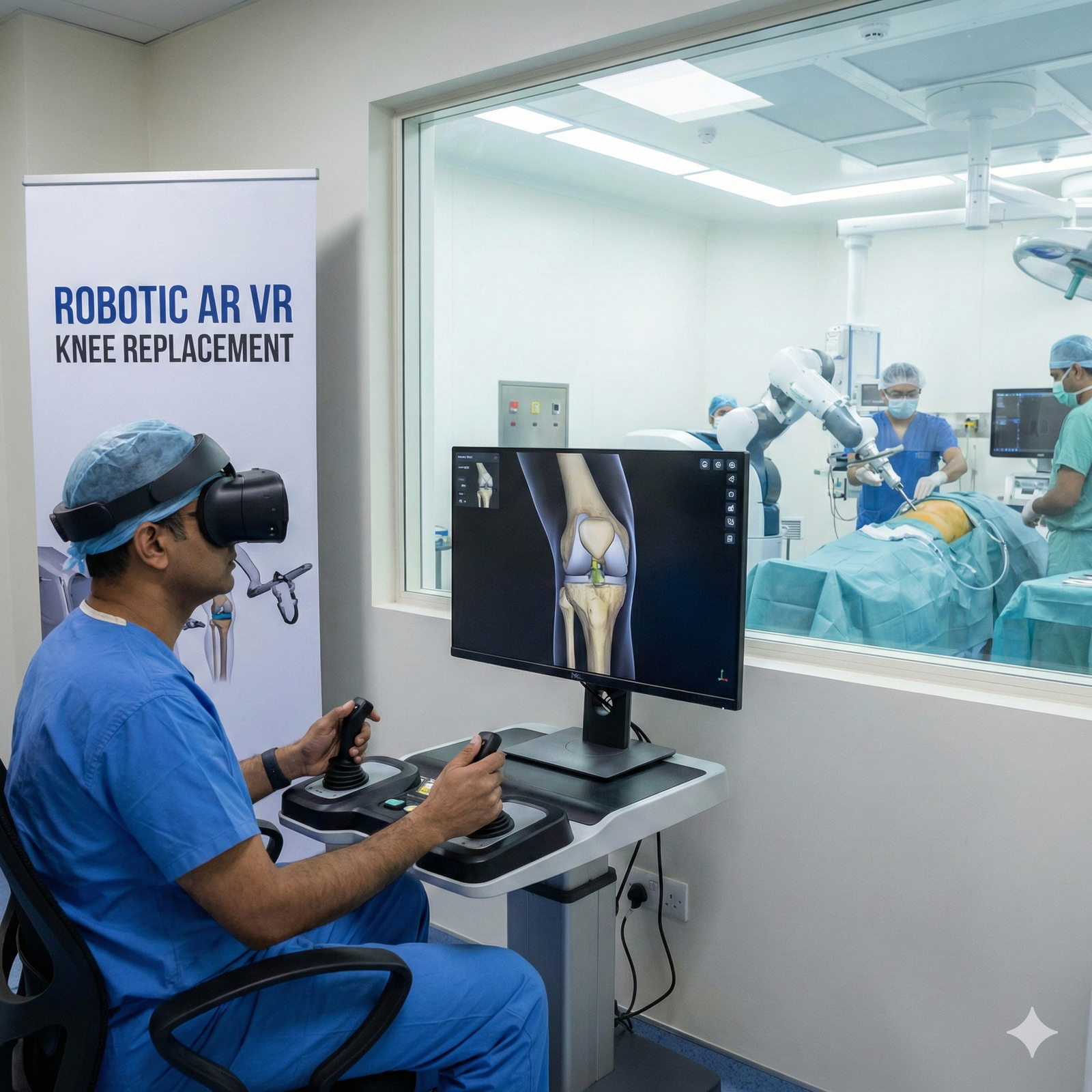 While both provide precision, robotic surgery uses a mechanical arm to assist cuts. AR-VR surgery uses augmented reality headsets to project a digital "X-ray" view directly onto the joint. This gives the surgeon continuous real-time data without needing bulky equipment, making it a more streamlined and often faster procedure with the same high accuracy.